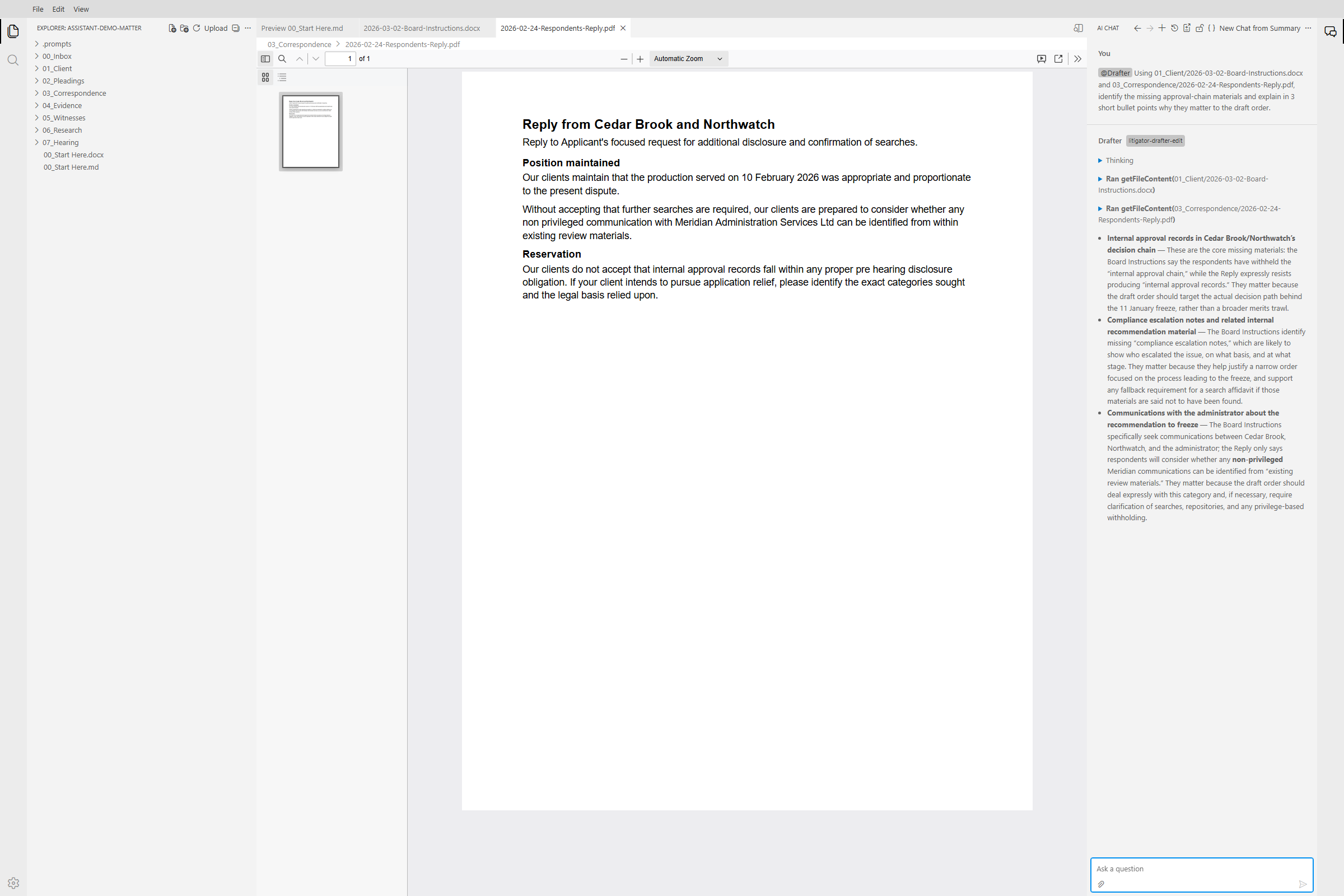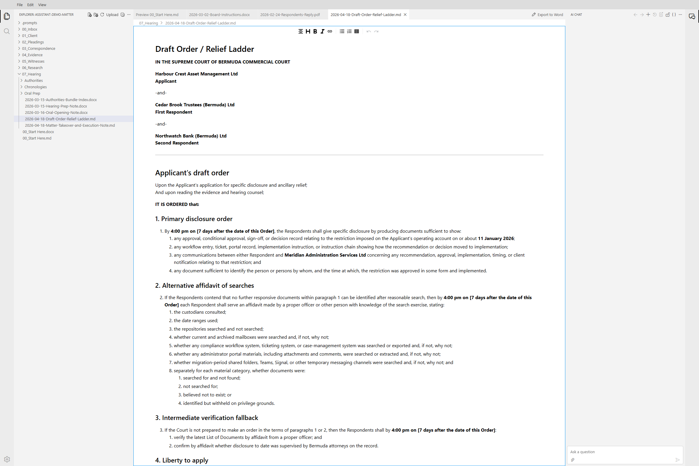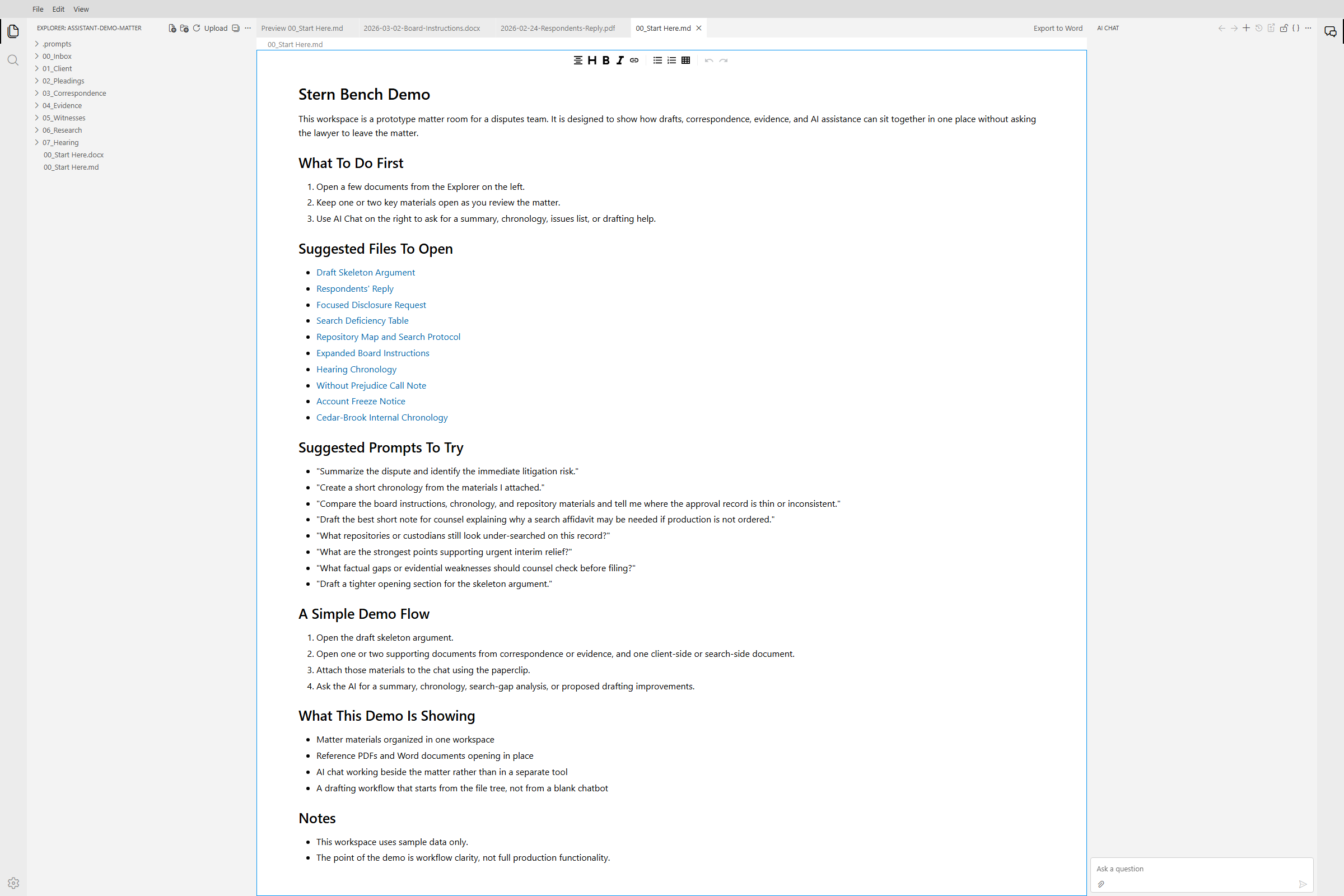 SternBench Assistant is meant for document-heavy legal work, including research notes, internal memoranda, draft submissions, chronologies, witness materials, case analyses, and other matter documents that need to be developed with the relevant authorities close at hand.