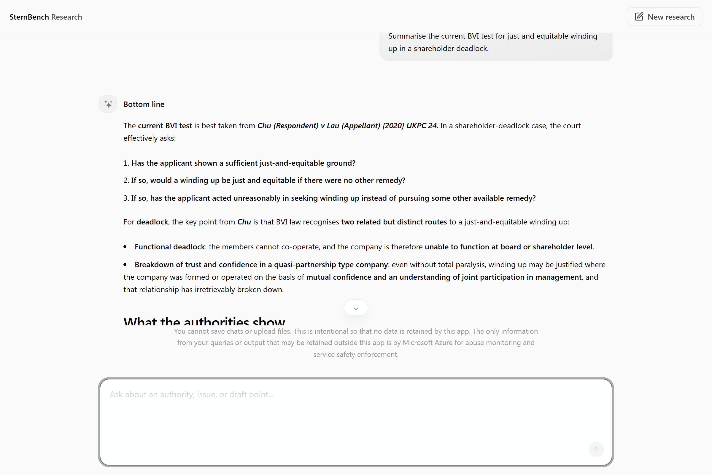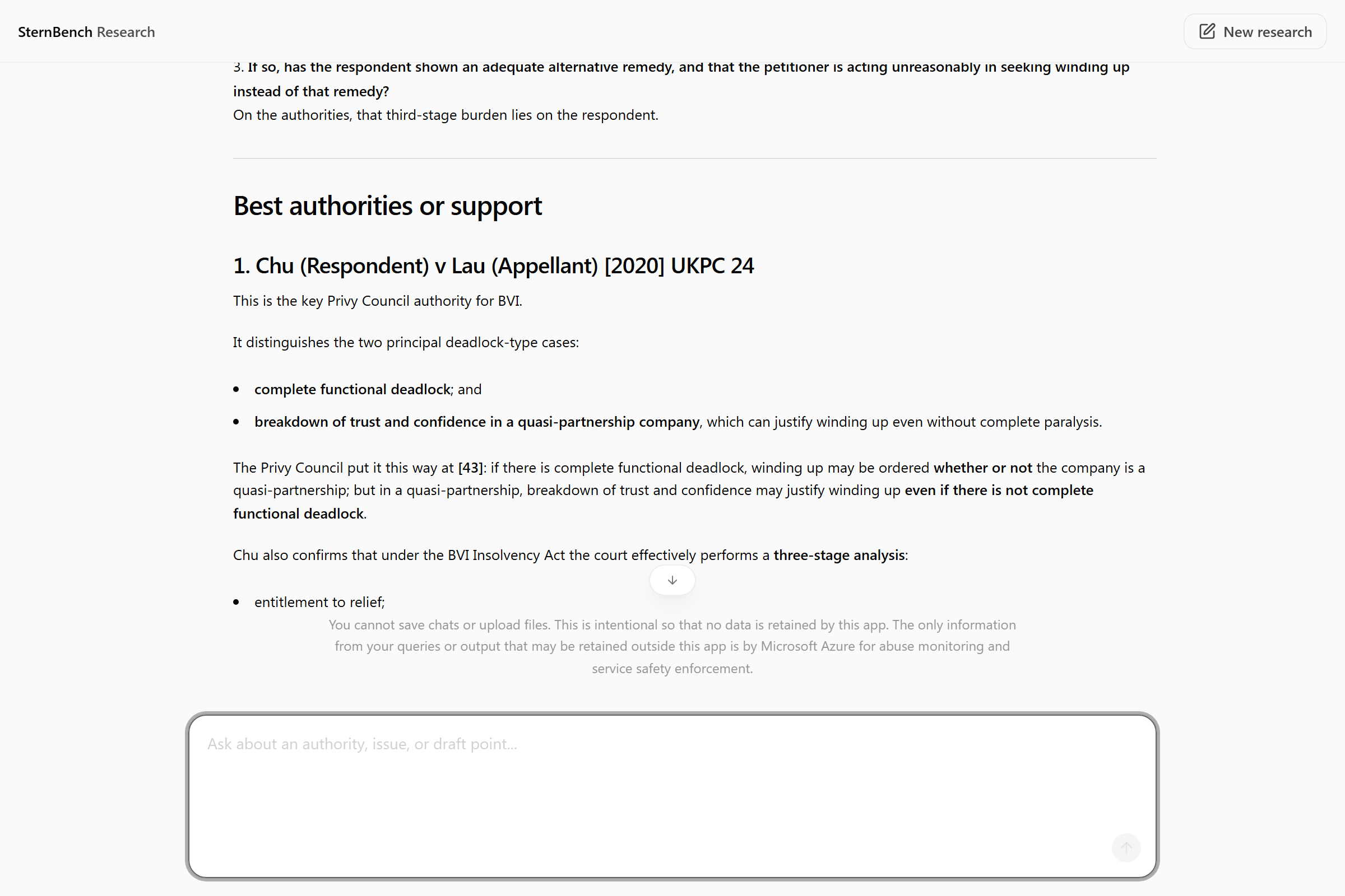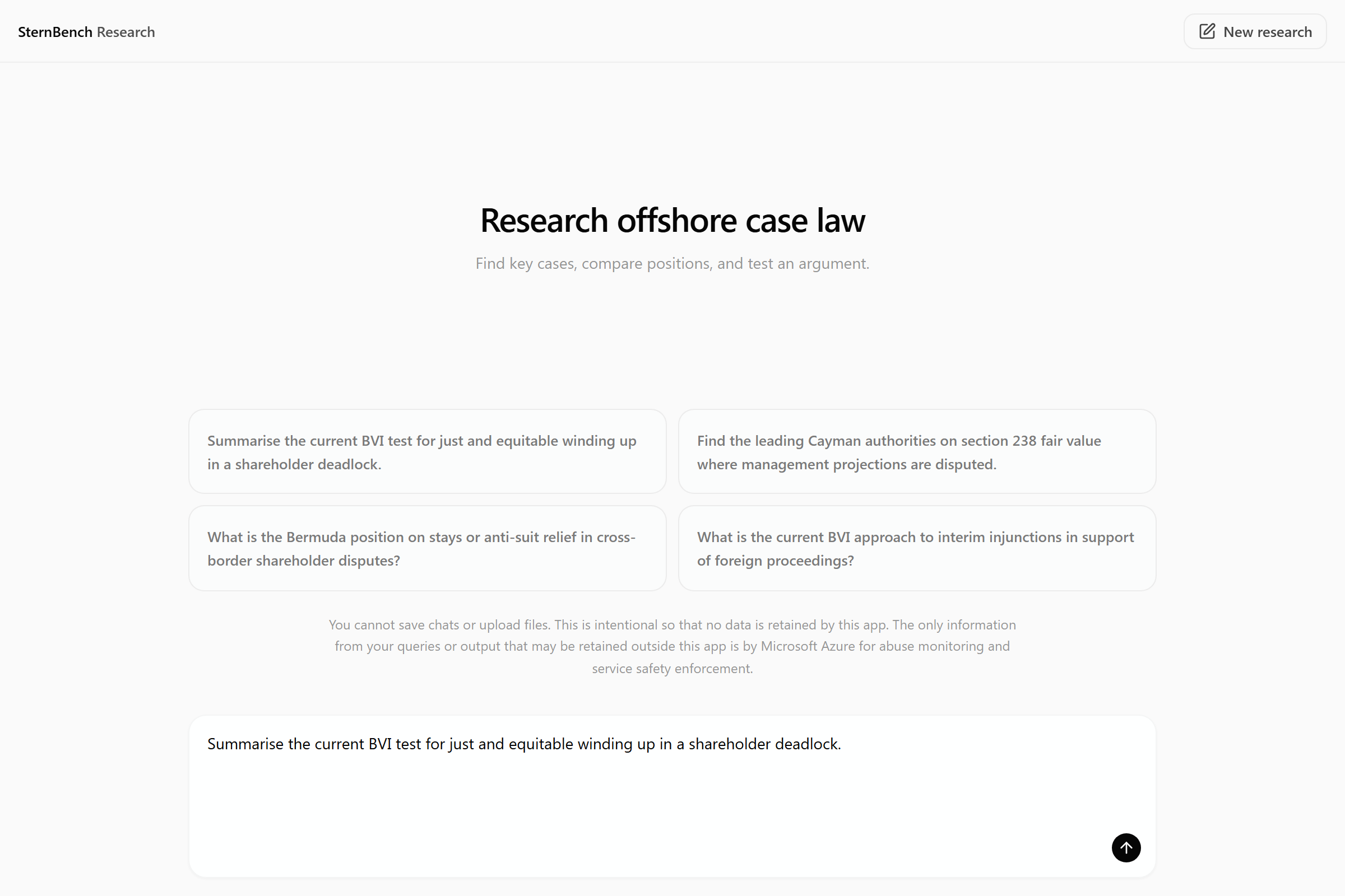 SternBench Research is an AI chat built on the full SternBench case law database. It has access to the structured offshore corpus of 17,000+ judgments and is designed to answer research questions by working across that database.